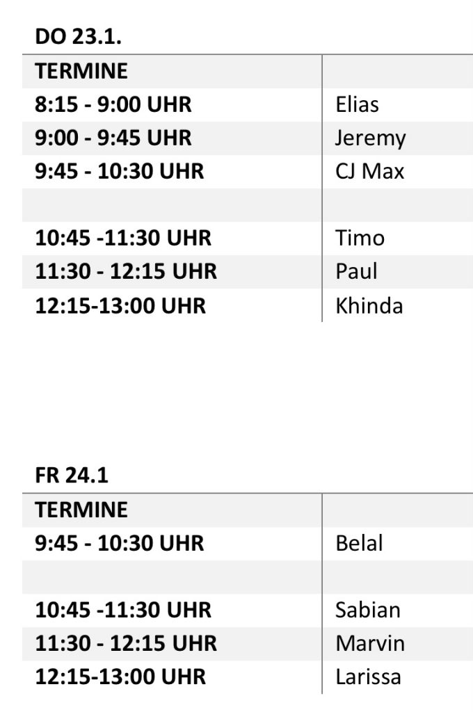 Donnerstag, 23.01.2025: Home-Office, Praktikum (Jeremy, Larissa, Khinda, Elias) & Termine mit Frau Wyrwich.